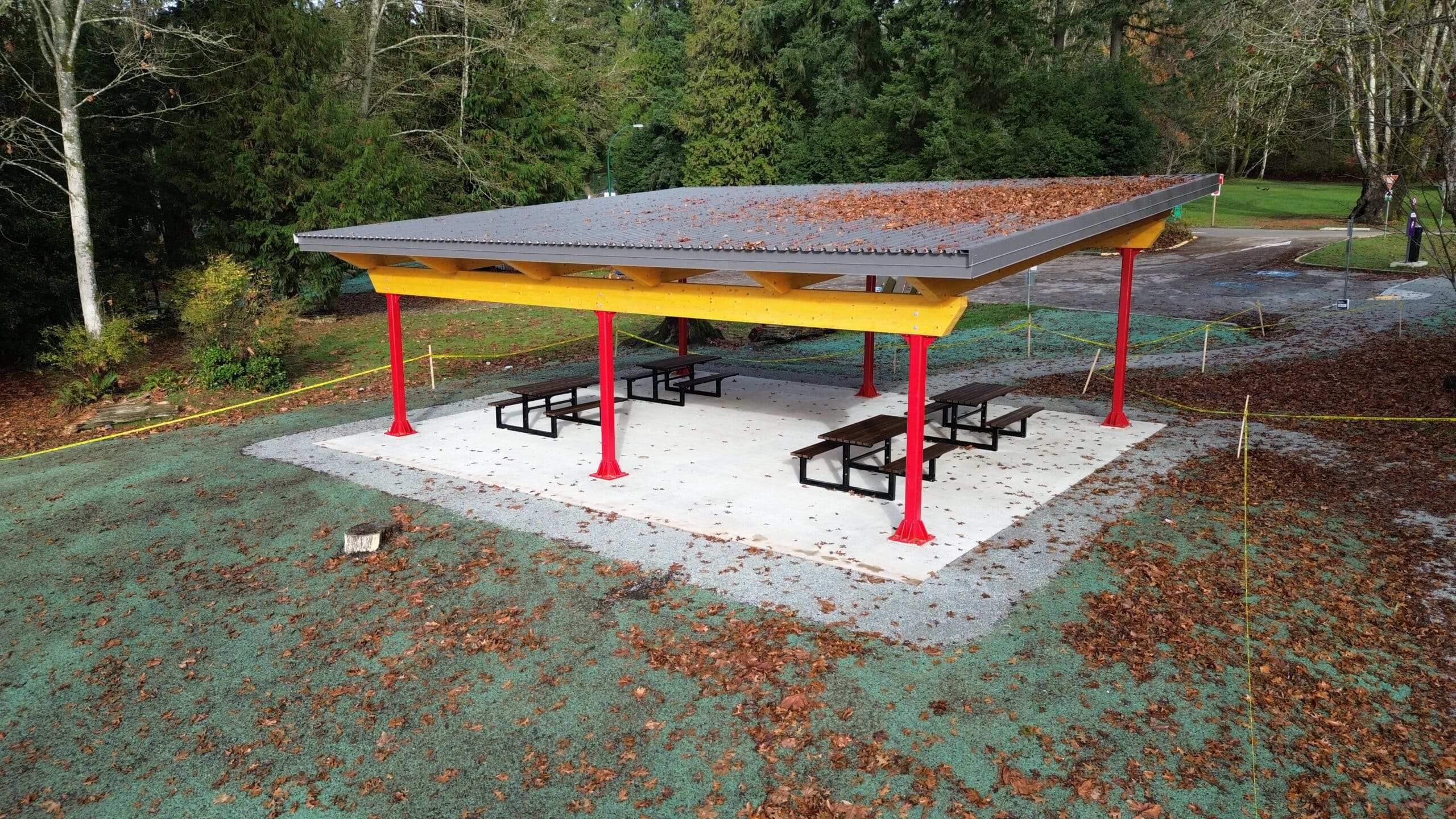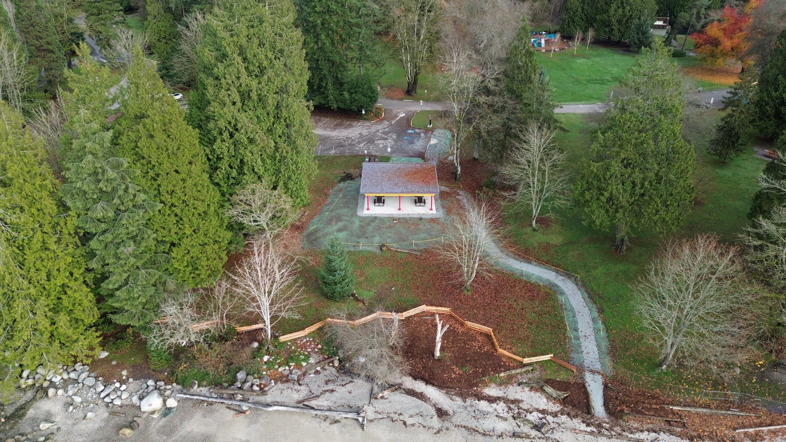 The səlilwətaɬ (Tsleil-Waututh Nation) Natural Resource Planning Team is excited to announce significant progress on the Whey-ah-Wichen shoreline restoration project. This fall saw the completion of the upland portion of the project. Perhaps the most exciting feature is a new picnic shelter, located between the boat launch and Wally’s Burgers, which features səlilwətaɬ red posts and yellow cedar beams.