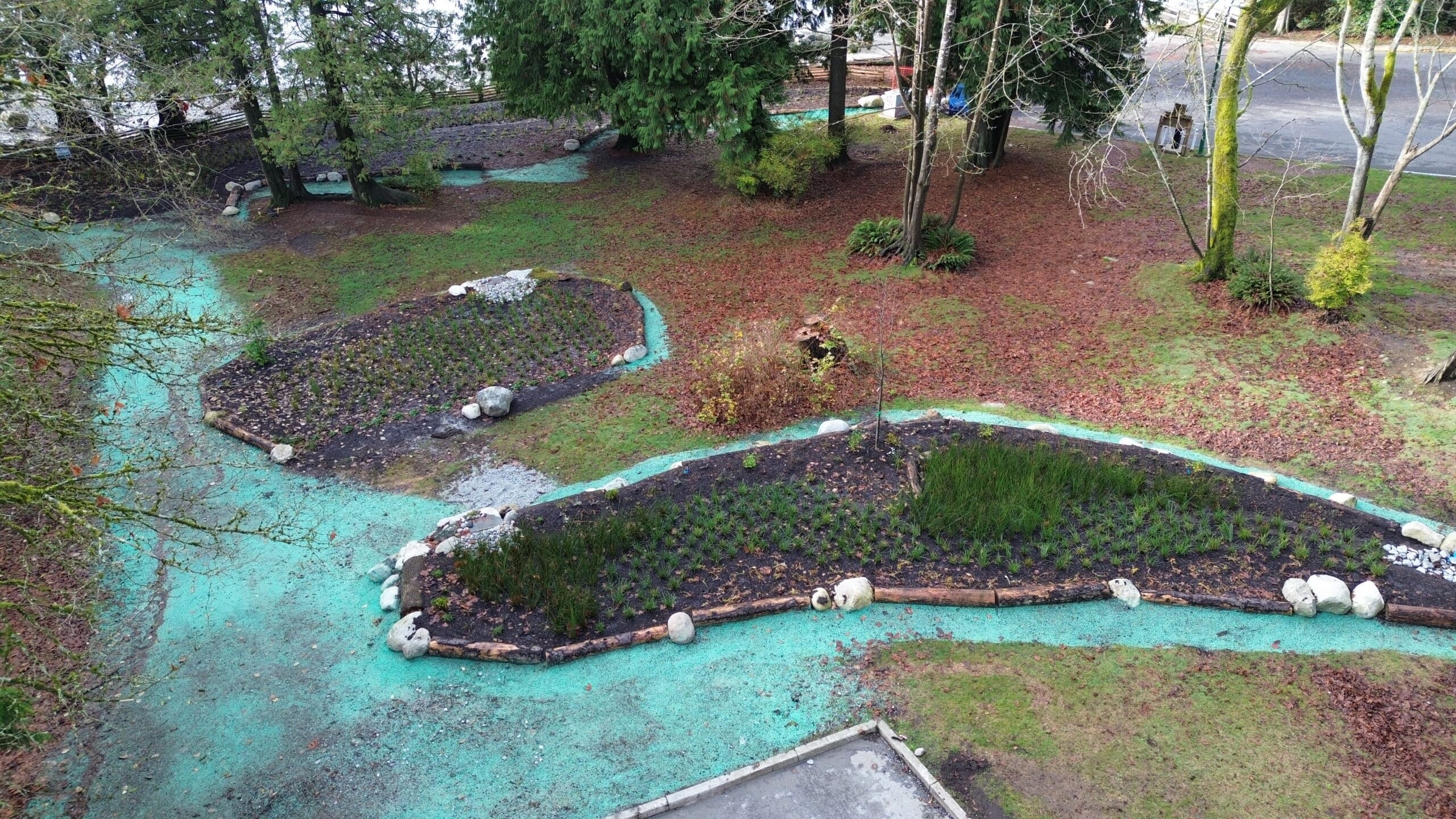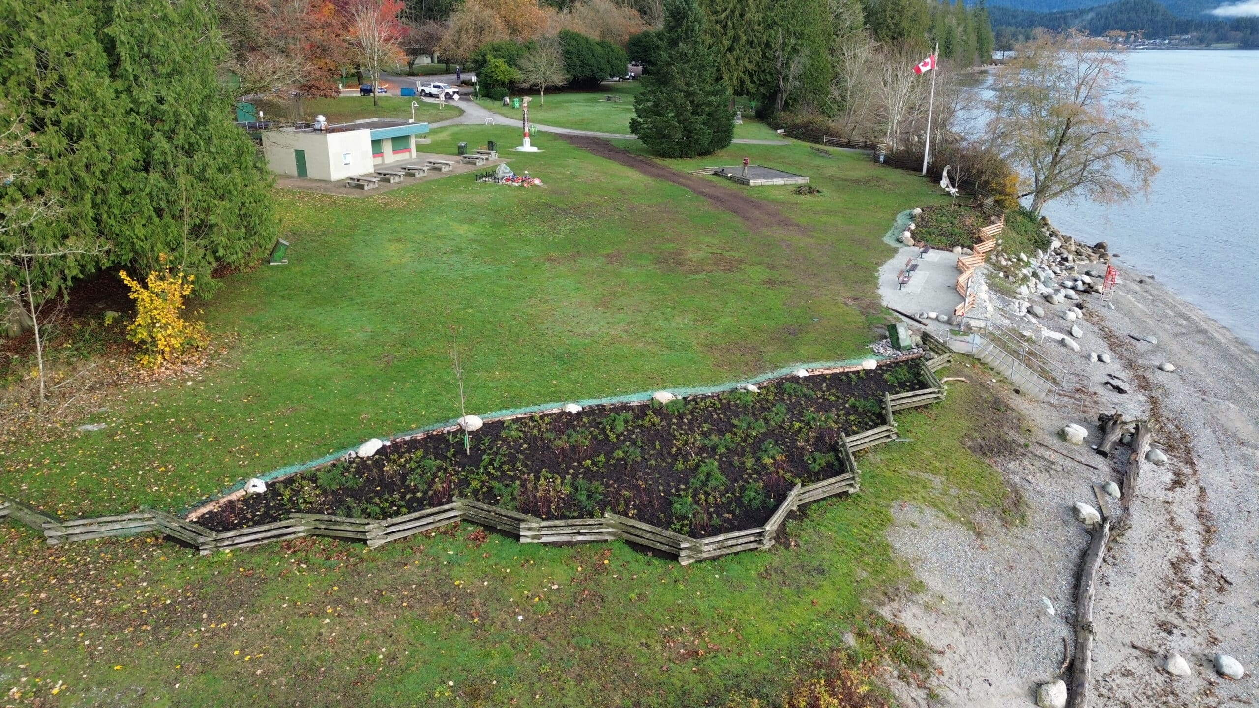 In the meantime, a contractor will be planting dune grass and additional riparian plants at Roche Point. In addition, the District of North Vancouver’s park staff will be top dressing the existing lawn and monitoring the new seeding (the turquoise dirt in the above images) to ensure a healthy lawn come summertime.