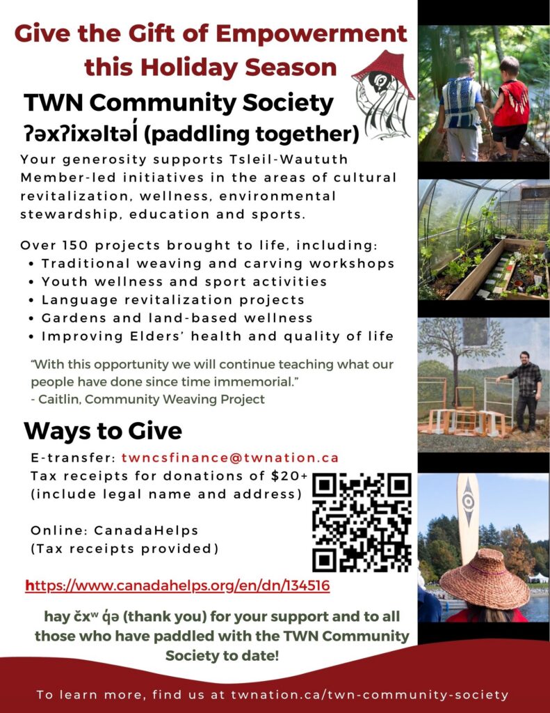 - Prefer to e-transfer? Donations can be sent directly to the TWN Community Society at twncsfinance@twnation.ca